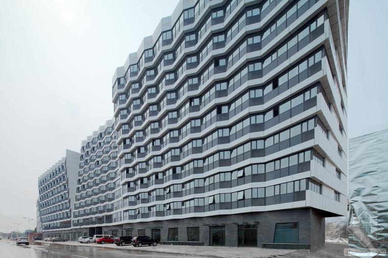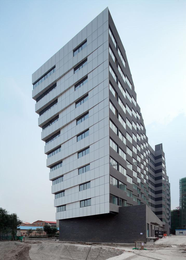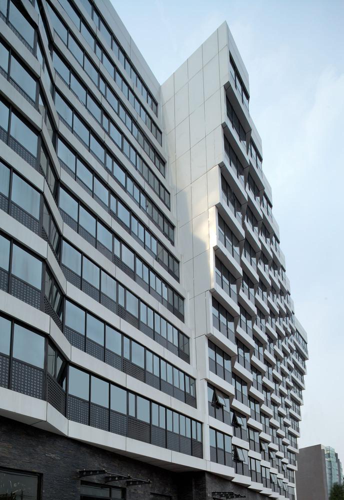 建筑的底層是展廳和商業(yè)。公寓部分在二層以上,大約占總建筑面積的三分之二,因分屬于三個投資人,業(yè)主希望從形式上有區(qū)分,突出各自的獨立性。我們以公寓面寬為基準定義出一個標準戶型的外觀形式,在南立面上進行重復,通過基本單元有序的懸挑形成錯動,發(fā)展出水平和垂直方向富有動感的體量變化,進而強調(diào)出辦公和兩部分公寓的清晰分界。于是集合體明確地呈現(xiàn)出四部分,一個底座和上面三個起伏的體塊,為內(nèi)容的不同提供了明顯的標識。